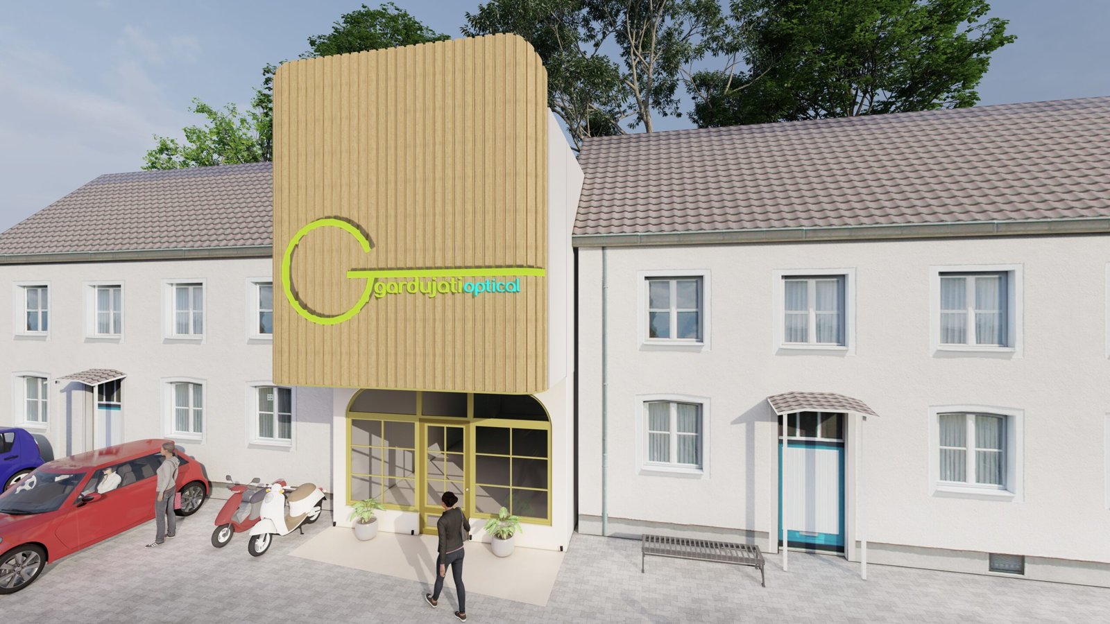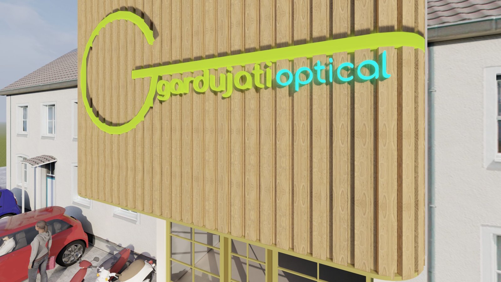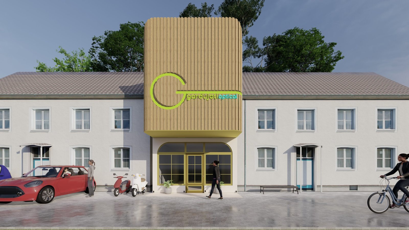 The design concept of the optical store presents a modern and nature-inspired façade that reflects clarity, comfort, and professionalism. A prominent vertical wooden element highlights the brand identity and creates a strong yet warm visual focus, while clean lines and soft curved openings add a sense of approachability and elegance. Large glass areas promote transparency and natural light, reinforcing trust and openness, and the green signage emphasizes eye health and sustainability. Overall, the design blends modern minimalism with natural materials to create a calm and welcoming optical retail experience suited to an urban context.