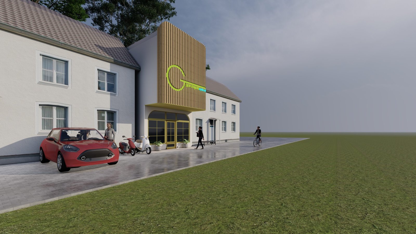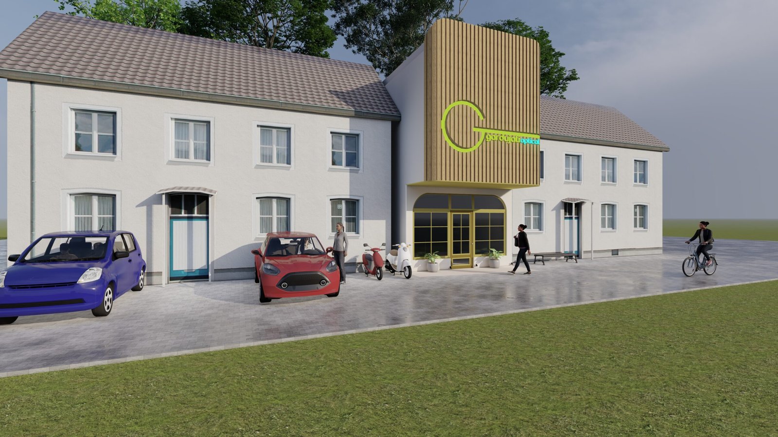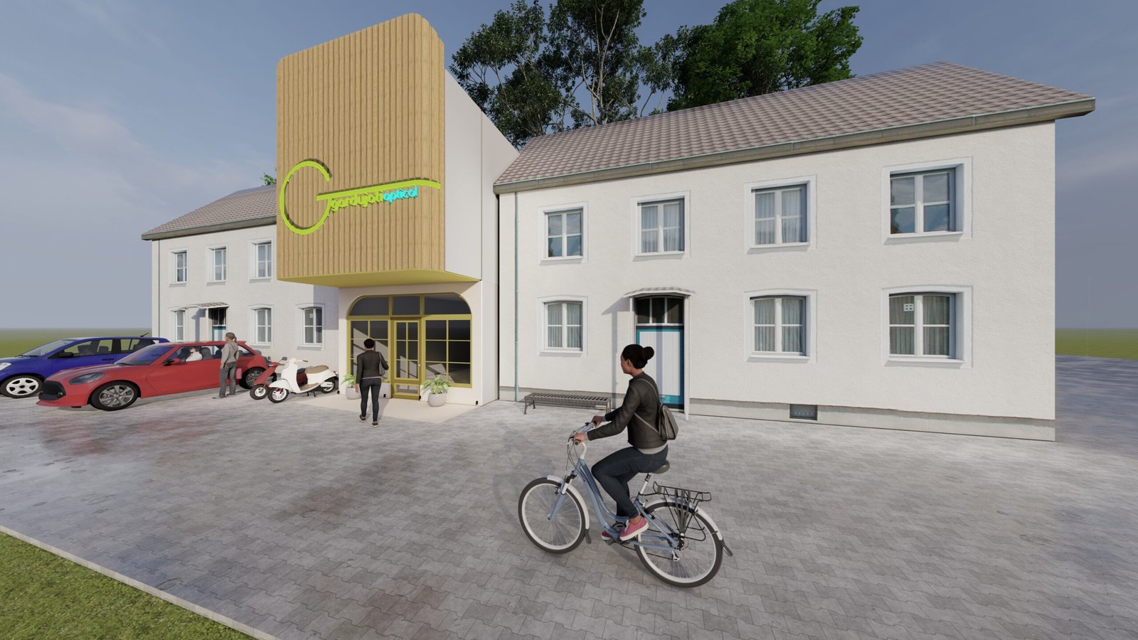 The design concept of the optical store presents a modern and nature-inspired façade that reflects clarity, comfort, and professionalism. A prominent vertical wooden element highlights the brand identity and creates a strong yet warm visual focus, while clean lines and soft curved openings add a sense of approachability and elegance. Large glass areas promote transparency and natural light, reinforcing trust and openness, and the green signage emphasizes eye health and sustainability. Overall, the design blends modern minimalism with natural materials to create a calm and welcoming optical retail experience suited to an urban context.